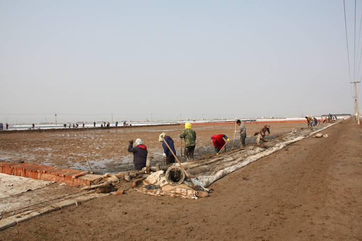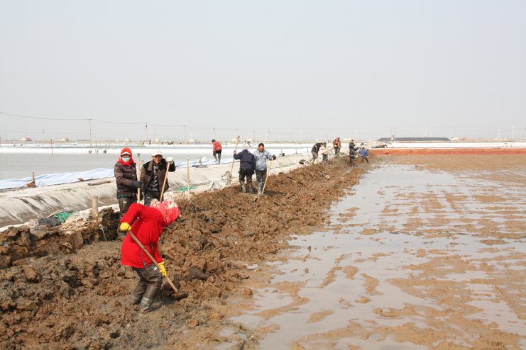 3月21日,在新河制鹽分公司八班的一期結(jié)晶區(qū),一片火熱景象,只見大家正在灘內(nèi)揮膀大干,挖泥的、和泥的、打堰的,配合密切,運作熟練,參加勞動的職工足有50余人。“為了加快食用原料海鹽基地建設(shè)進度,今天,我們集中了7個組班的員工幫助八班維修下馬格格堰,爭取早日灌池生產(chǎn)。”正在工作現(xiàn)場安排工作的該公司經(jīng)理安樹林說道。