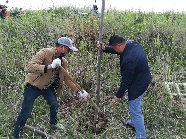 大家下午一點(diǎn)三十出發(fā),每人帶上鐵锨或者鐵楸,前往目的地。全體員工都相互協(xié)作,四人一組搬運(yùn)樹苗,填土栽植,經(jīng)過兩天的勞動完成了二百三十三畝土地共五百四十棵樹苗的栽植任務(wù)。