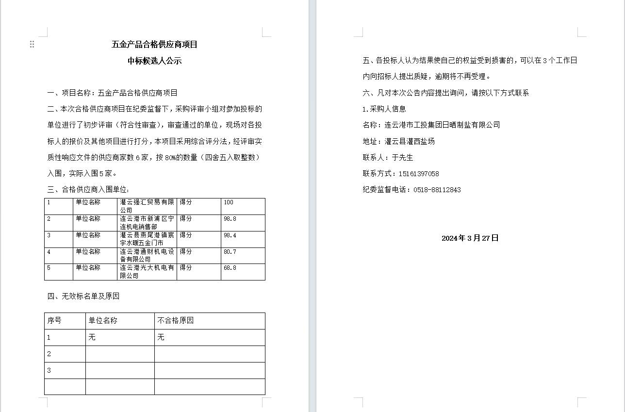 五金產(chǎn)品合格供應商項目中標候選人公示