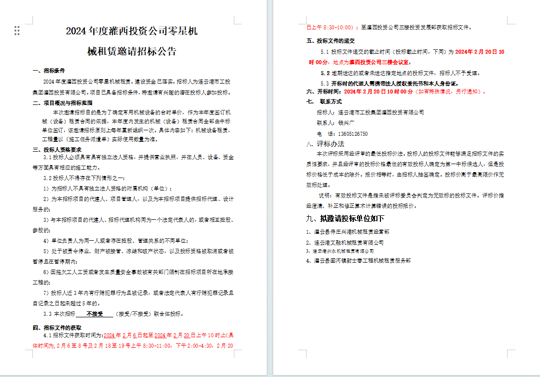 2024年度灌西投資公司零星機(jī) 械租賃邀請(qǐng)招標(biāo)公告