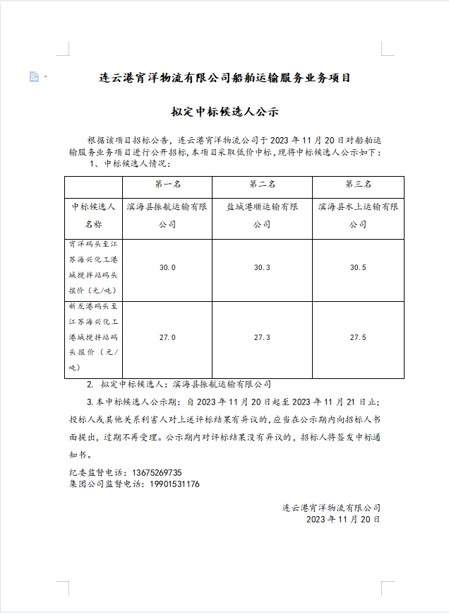 連云港宵洋物流有限公司船舶運輸服務(wù)業(yè)務(wù)項目擬定中標(biāo)候選人公示