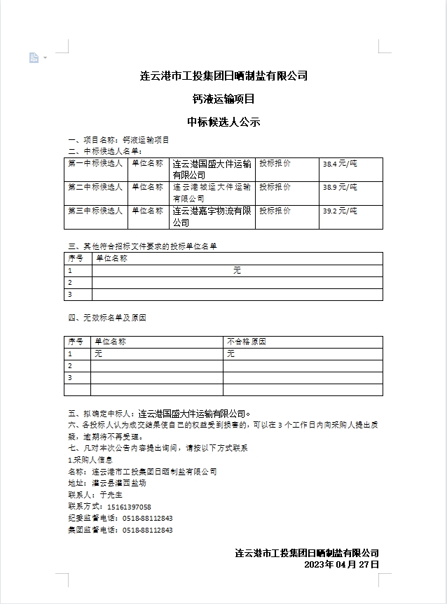 連云港市工投集團日曬制鹽有限公司鈣液運輸項目中標(biāo)候選人公示
