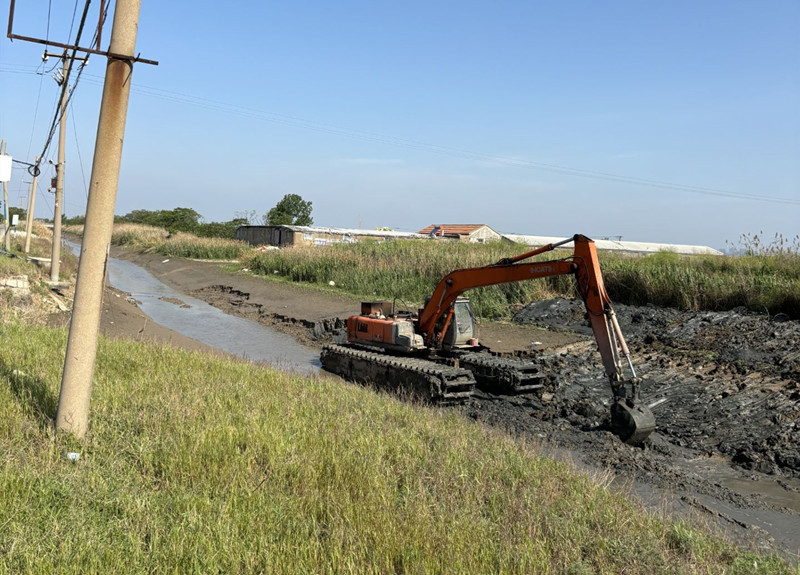 三洋分場高效養(yǎng)殖基地,挖掘機(jī)正揮舞手臂,進(jìn)行進(jìn)排水渠疏浚作業(yè),為防汛做好前期準(zhǔn)備工作,保障汛期安全穩(wěn)定。(青宣 田盛楠 史小?。?/span>