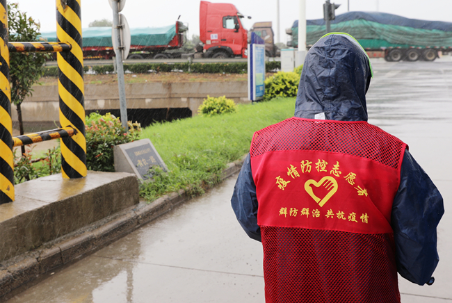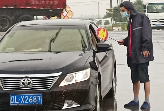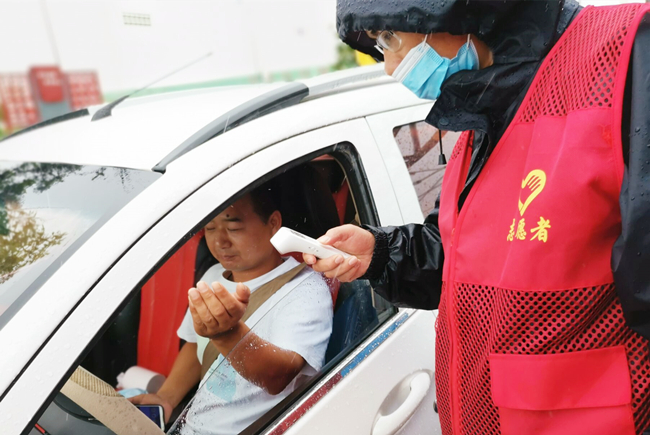 “您好,請(qǐng)出示一下行程碼,做下登記。”堅(jiān)守在崗位,逆風(fēng)迎雨,對(duì)車輛進(jìn)行逐一登記和體溫檢查,絲毫沒有受天氣的影響。