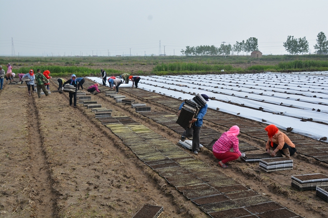 種糧大戶俞正猛正在張羅工人們擺盤育秧。運(yùn)盤、擺盤、覆膜、壘土,工人們或快速或仔細(xì)地高效運(yùn)轉(zhuǎn)著,三輛三輪車前后停在田埂上,車上整齊的擺放著數(shù)以萬盤的暗化苗,這些暗化苗來自生態(tài)種養(yǎng)中心育秧大棚,硬盤里面一層軟盤放入基質(zhì),撒入稻種,在大棚里通過一定的溫度和濕度的科學(xué)管理,出芽后運(yùn)送到各個(gè)田頭。男工負(fù)責(zé)把硬盤在秧板上均勻放好,再由心細(xì)的女工把軟盤從硬盤上拿出擺放在秧板地上,一條秧板擺完,立刻蓋上無紡布薄膜,就地挖土壓住防風(fēng),保護(hù)好秧苗不被曬傷??盏挠脖P運(yùn)到田邊由專人整理回收最后運(yùn)回生態(tài)種養(yǎng)中心。全部擺完以后上好水,一整套工序就算完成。不到一天時(shí)間,一萬多盤秧盤已經(jīng)被工人們?nèi)粩[完。