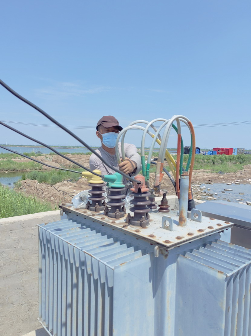 10時(shí)40分搶修工作全面展開(kāi),當(dāng)天地下氣溫接近38度,塔臺(tái)上氣溫接近50度,變壓器上燙的要命,人在上面只是感覺(jué)熱浪滾滾,電工尹永明身上衣服很快被汗水濕透,太陽(yáng)暴曬,如火的驕陽(yáng)絲毫沒(méi)有阻擋施工進(jìn)度,一切工作都進(jìn)行的繁忙有序,井井有條。中午12時(shí)30分經(jīng)過(guò)近2個(gè)小時(shí)的搶修,工作人員完成了變壓器的維修任務(wù),保證了魚(yú)塘用電設(shè)備的正常運(yùn)轉(zhuǎn)。