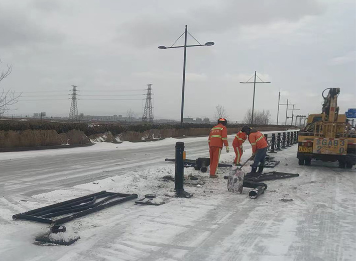 近兩日,因雨雪天氣,道路結(jié)冰濕滑,車輛行駛過程中發(fā)生意外,造成港前大道、海濱大道、228國道等地段發(fā)生多起道路護欄等設(shè)施損壞情況。收到信息后,市政分公司道路養(yǎng)護人員迅速反應,在班長孫寬成帶領(lǐng)下,隊員們頂風冒雪第一時間趕赴現(xiàn)場。